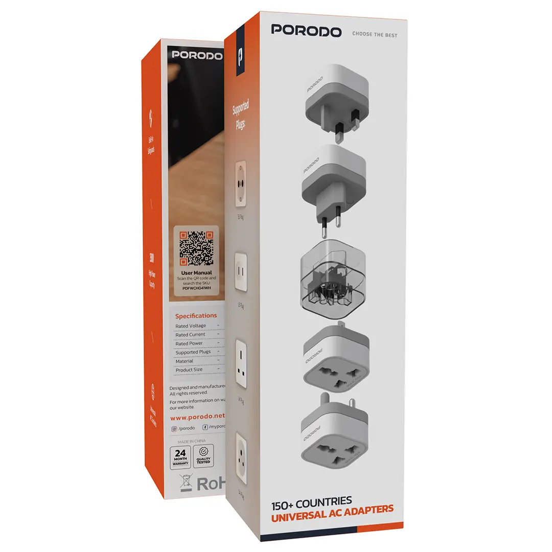 مبدل برق جهانی Porodo Universal AC Adapter یک انتخاب حرفهای برای افرادی است که به سفرهای بینالمللی میروند یا با دستگاههای برقی مختلف سروکار دارند.